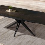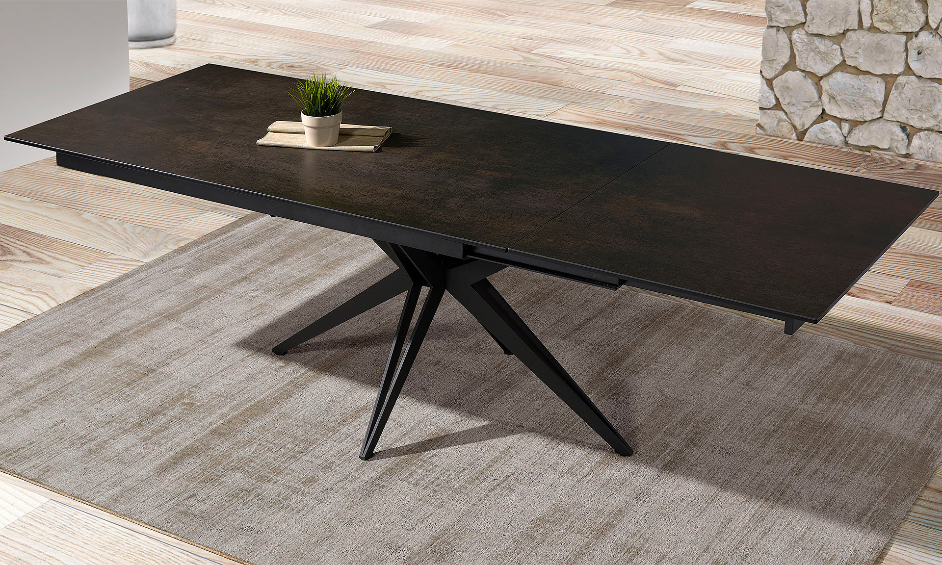Table rectangle plateau céramique noir marbré ou iron ton rouille, épaisseur 13 mm. Piètement métal gris anthracite finition poudre. Pieds épingle en croix. Céramique collée sur un verre d’épaisseur 10 mm. 1 allonge en bout escamotable de 80 cm.